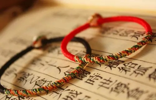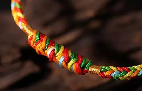 簡單的以五色絲線合股成繩,系于臂膀;在五彩繩上綴飾金錫飾物,掛于項頸;五彩繩折成方勝,飾于胸前;五彩繩結(jié)為人像戴之;以五彩絲線繡繪日月星辰烏獸等物,敬獻尊長。此俗始于漢代。